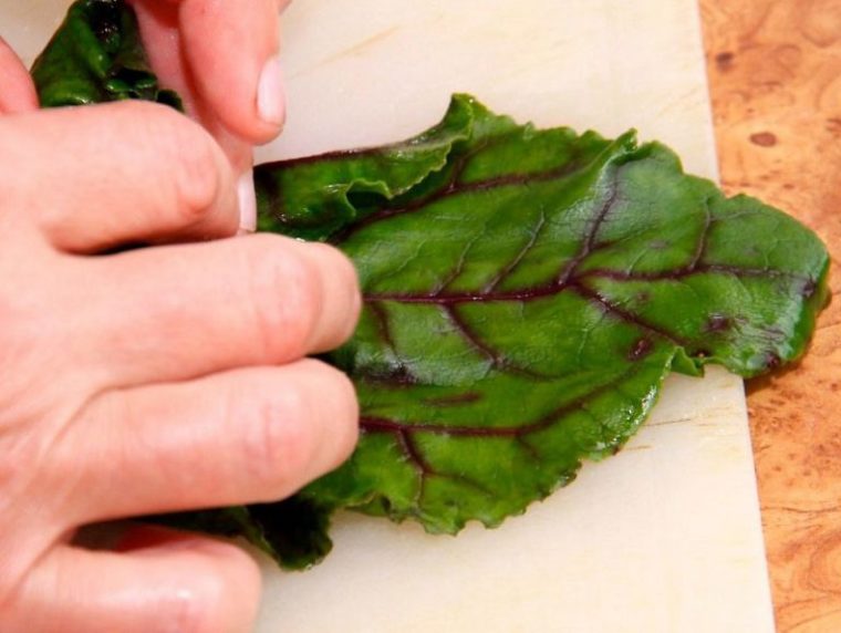4. Помийте бурякове листя, відріжте черешки, обшпарте окропом і злегка відбийте по центру.