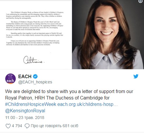 36-річна герцогиня Кембриджська написала зворушливий відкритий лист, спрямований на підтримку благодійної акції “Тиждень дитячих хоспісів”. Цього року акція отримала назву “Життя коротке”, а тому Кейт Міддлтон, яка з 2012 року виступає патроном хоспіс-центру East Anglia’s Children’s Hospices, підкреслила, наскільки важливо цінувати і використовувати по максимуму ті моменти, які дійсно мають значення.