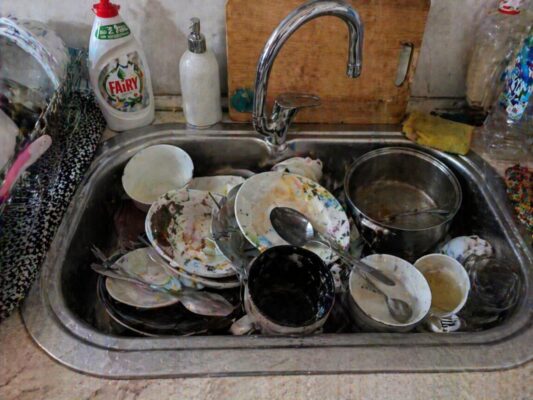 Вона зайшла на кухню, і всередині в неї все стислося. У раковині височіла гора брудних тарілок. Масні миски із залишками соусу, чашки з темним нальотом, каструля, до якої присохла каша